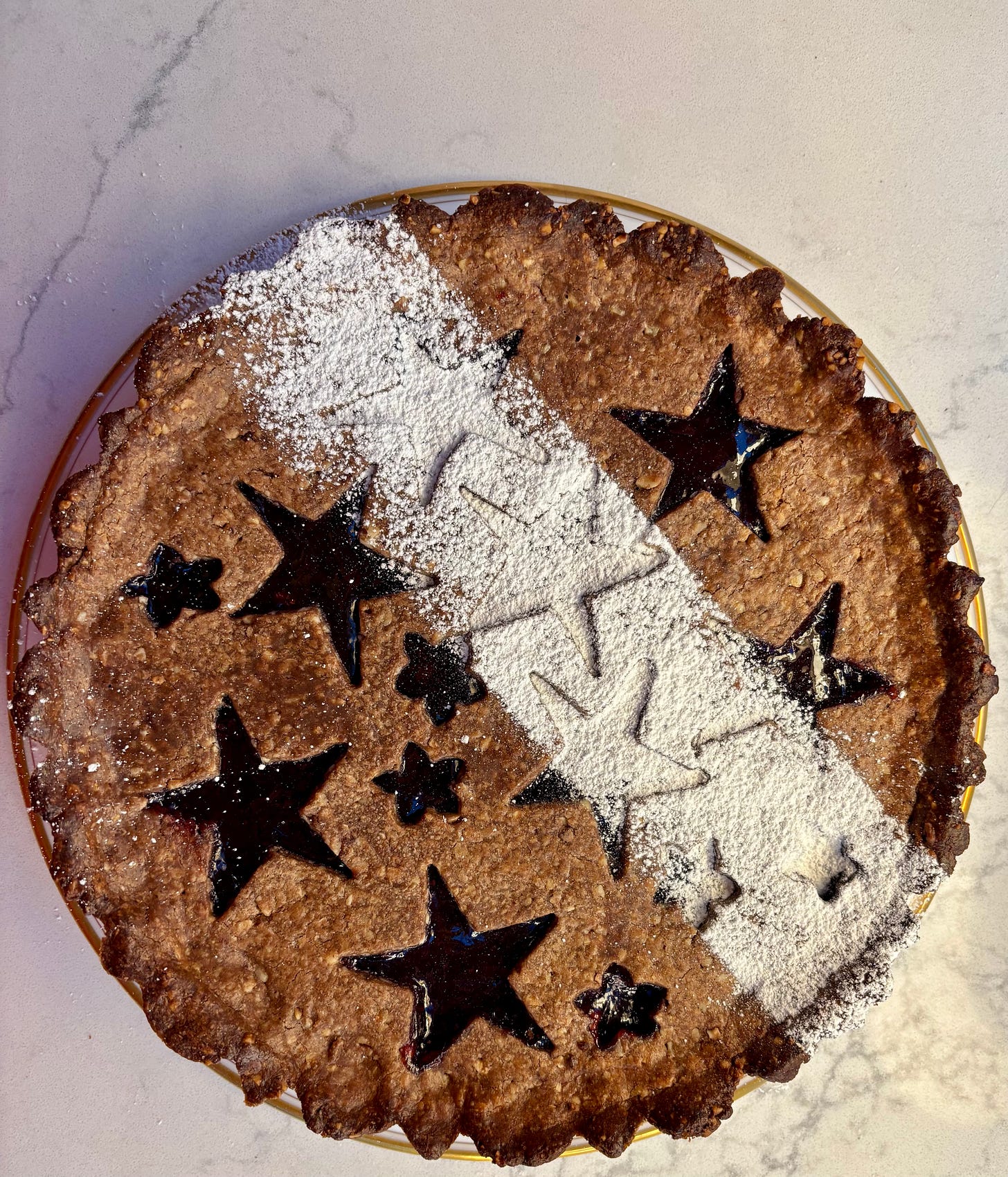 Linzertorte and linzer cookies, of course, were often the star of dessert on Christmas–yes, we were Jew-ish, as Richard Belzer used to say. My mom was from the tribe of Ethical Culture German Jews that inhabited the Upper East Side of Manhattan, and she ensured we celebrated the holiday with gusto. The first Linzertorte recipe I ever made, with encouragement from my mother, was cut from a Williams-Sonoma catalog some time in the 1980s. Since then, I’ve worked on my own take on the famous dessert, incorporating cocoa into the dough and tweaking the spices to suit. I also use hazelnuts, although feel free to use almonds if you prefer. I eschew (bless me!) a traditional lattice top in favor of one made with cookie cutters.