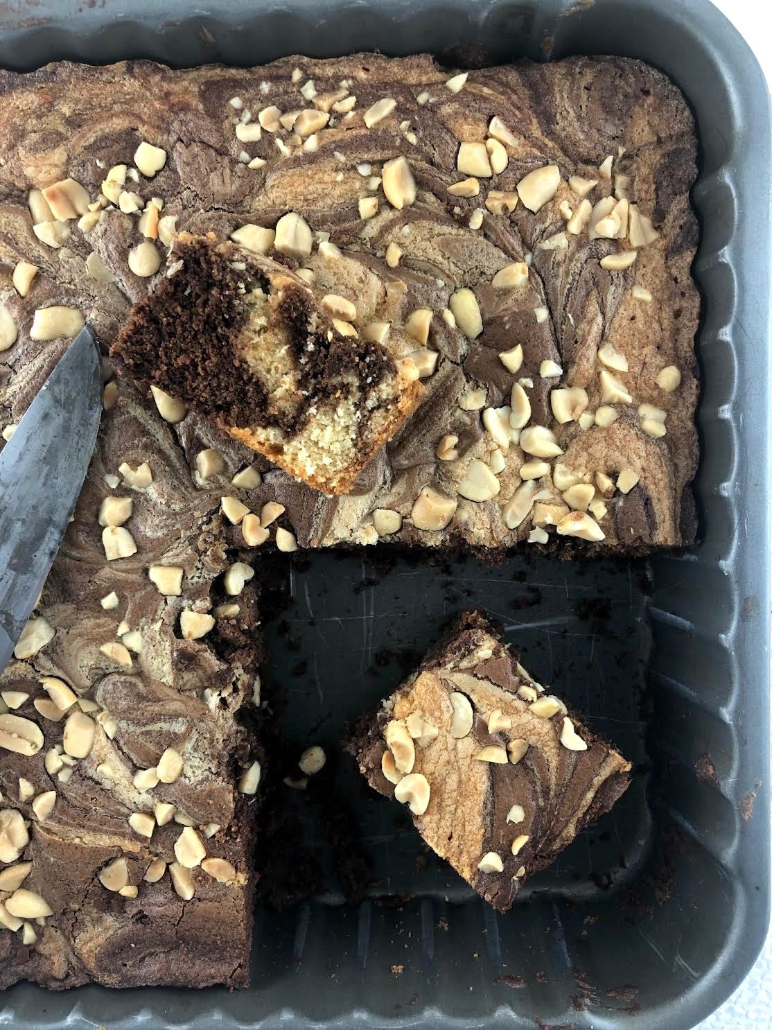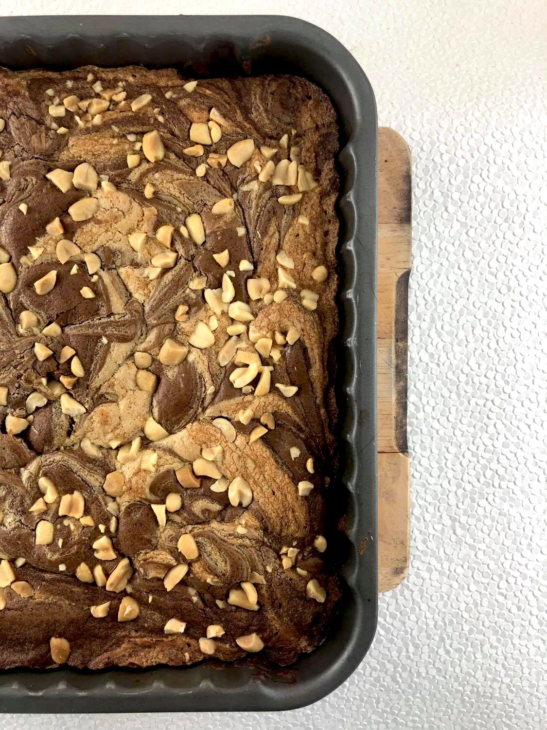 Spoon the two batters into the prepared brownie pan, then, using the long blade of a knife, swirl the two batters together to marble, evening out the top and spreading evenly to the edges and into the corners.