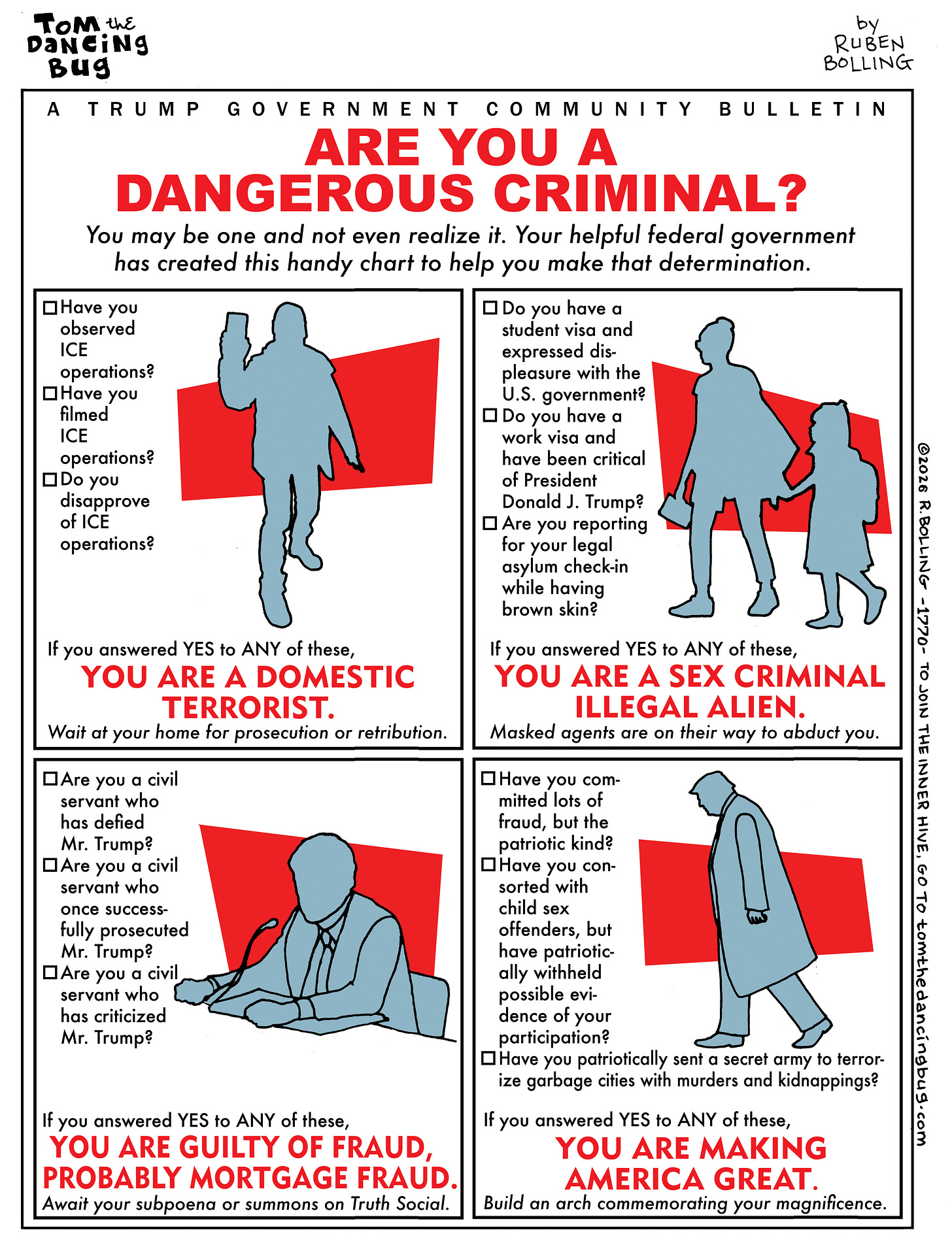 Follow Ruben Bolling on Substack ; join Tom the Dancing Bug’s Inner Hive subscription club; and please visit the Tom the Dancing Bug website, with information about The Complete Tom the Dancing Bug collection of books.