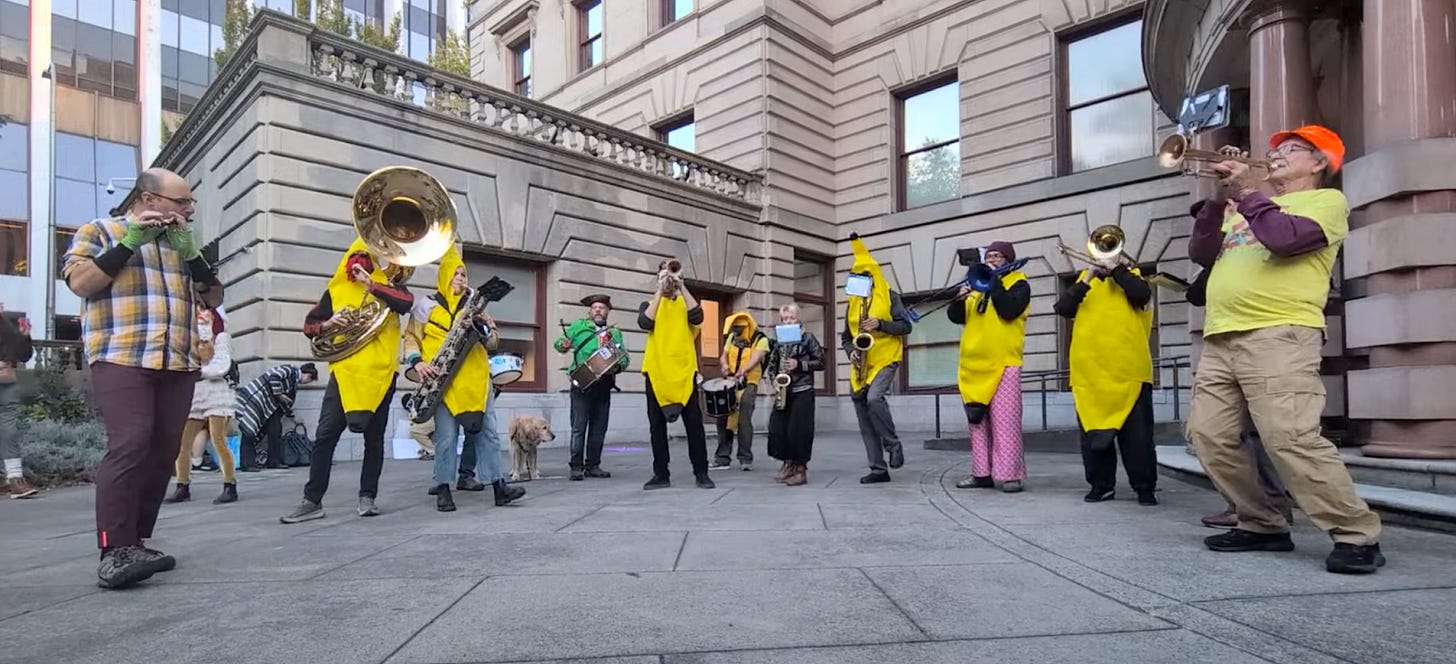 Contributing to the carnival-like atmosphere that afternoon, the Unpresidented Brass Band played music across the street from the ICE building. A fixture of anti-fascism rallies around Portland, the ensemble buoys demonstrators with its drum- and horn-heavy New Orleans style jams. Adding to the tactical frivolity, many of the band’s members play their instruments dressed up in banana costumes. (The look derives from an ironic version of the “Don’t Tread on Me” banner that the band carries, which substitutes the coiled rattlesnake of the Gadsden flag with a drawing of a slippery banana peel.)